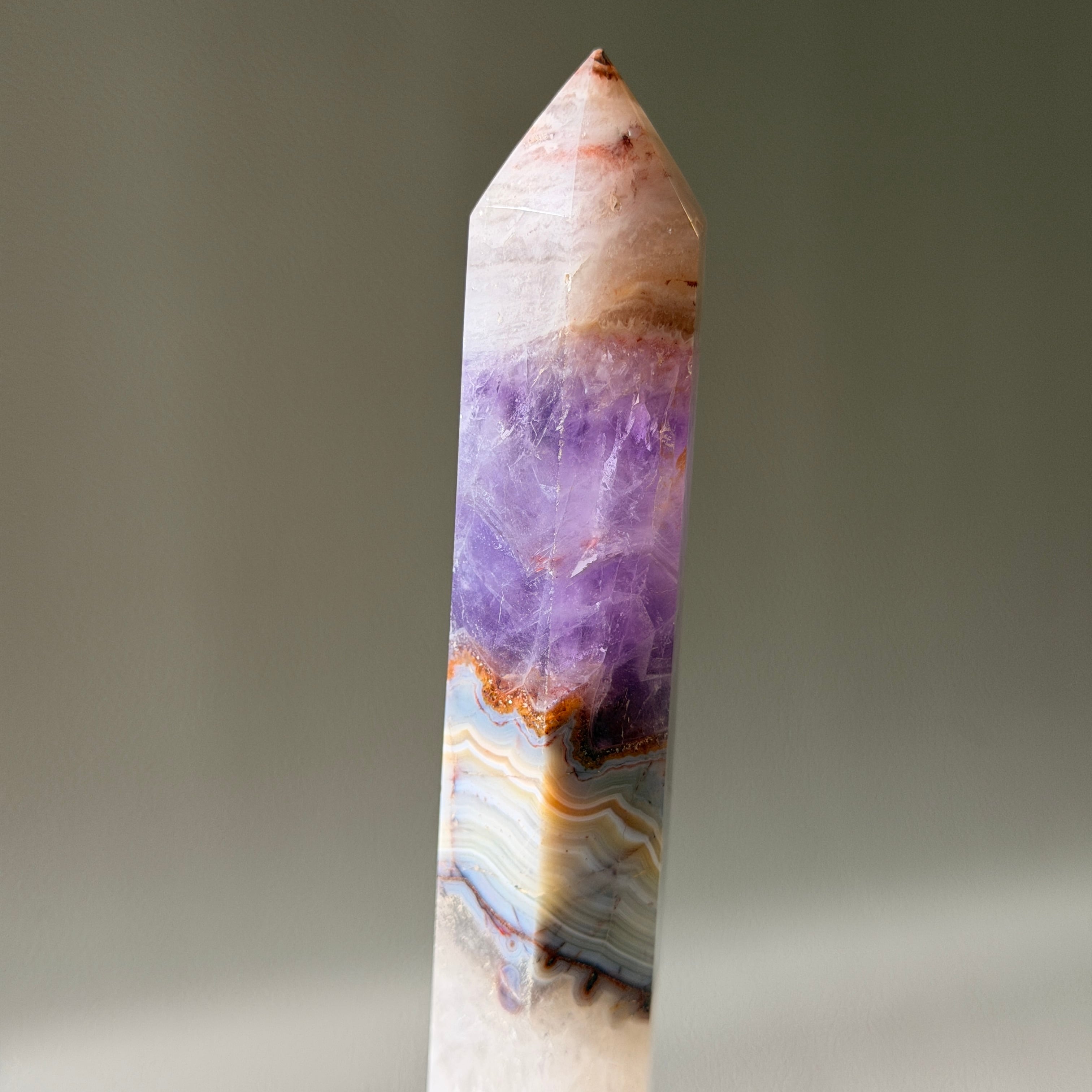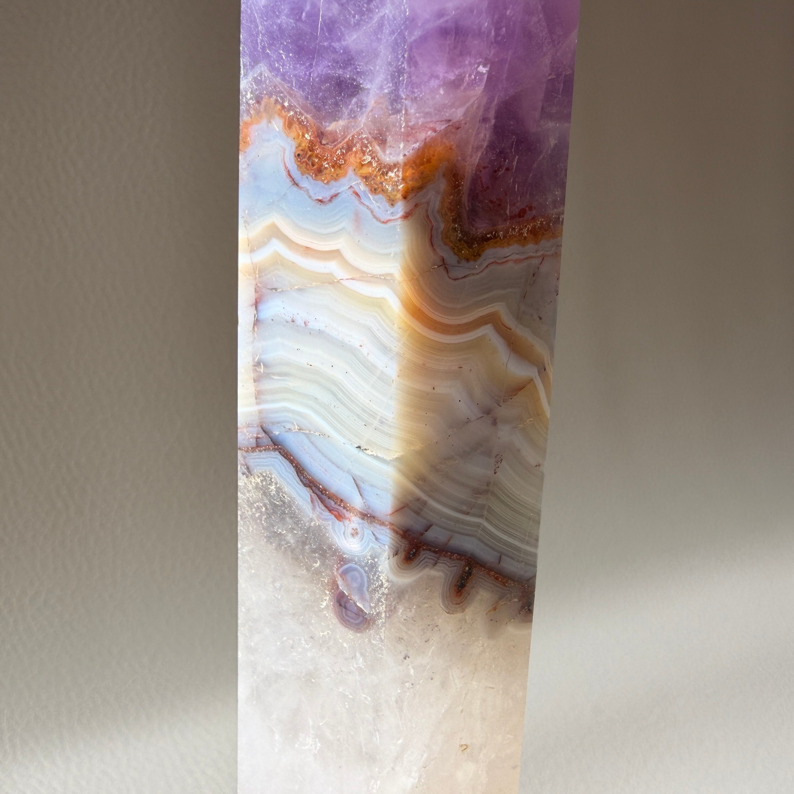 アメジストの紫とアゲートの層模様が美しく重なり合う、存在感のあるポイントです。