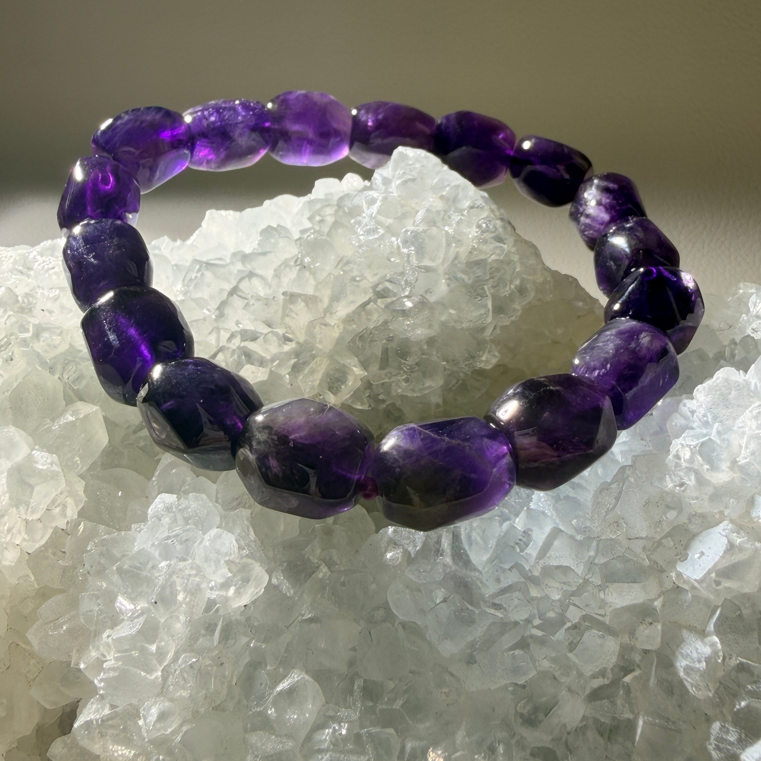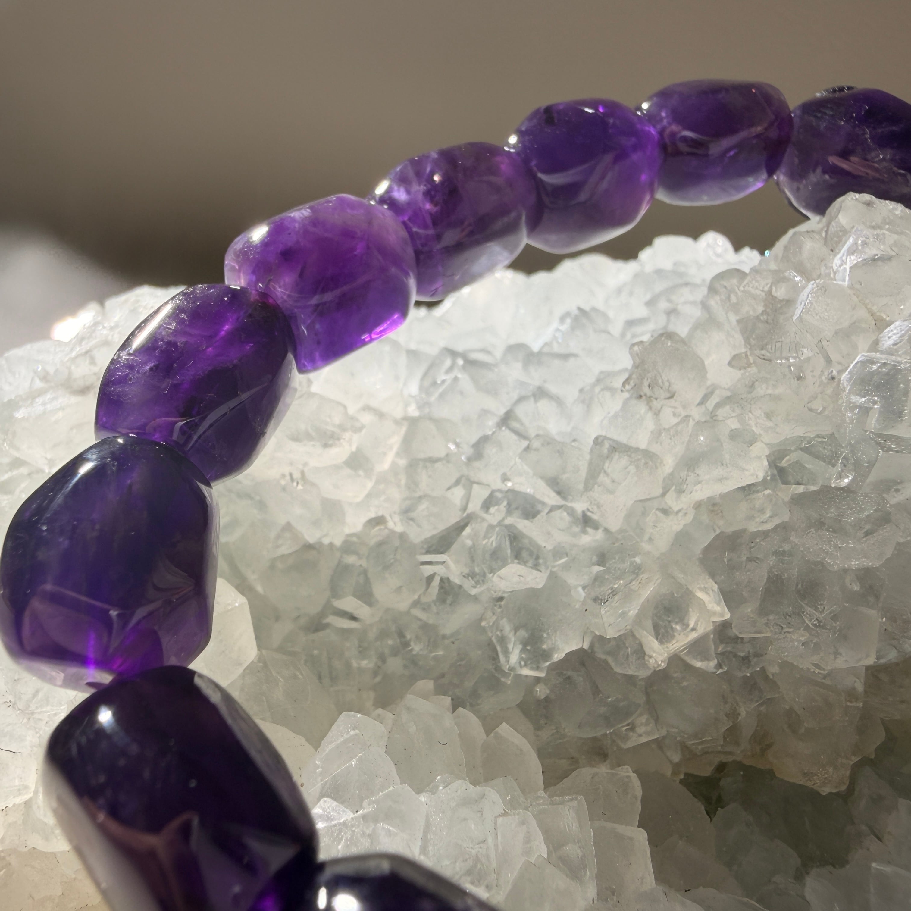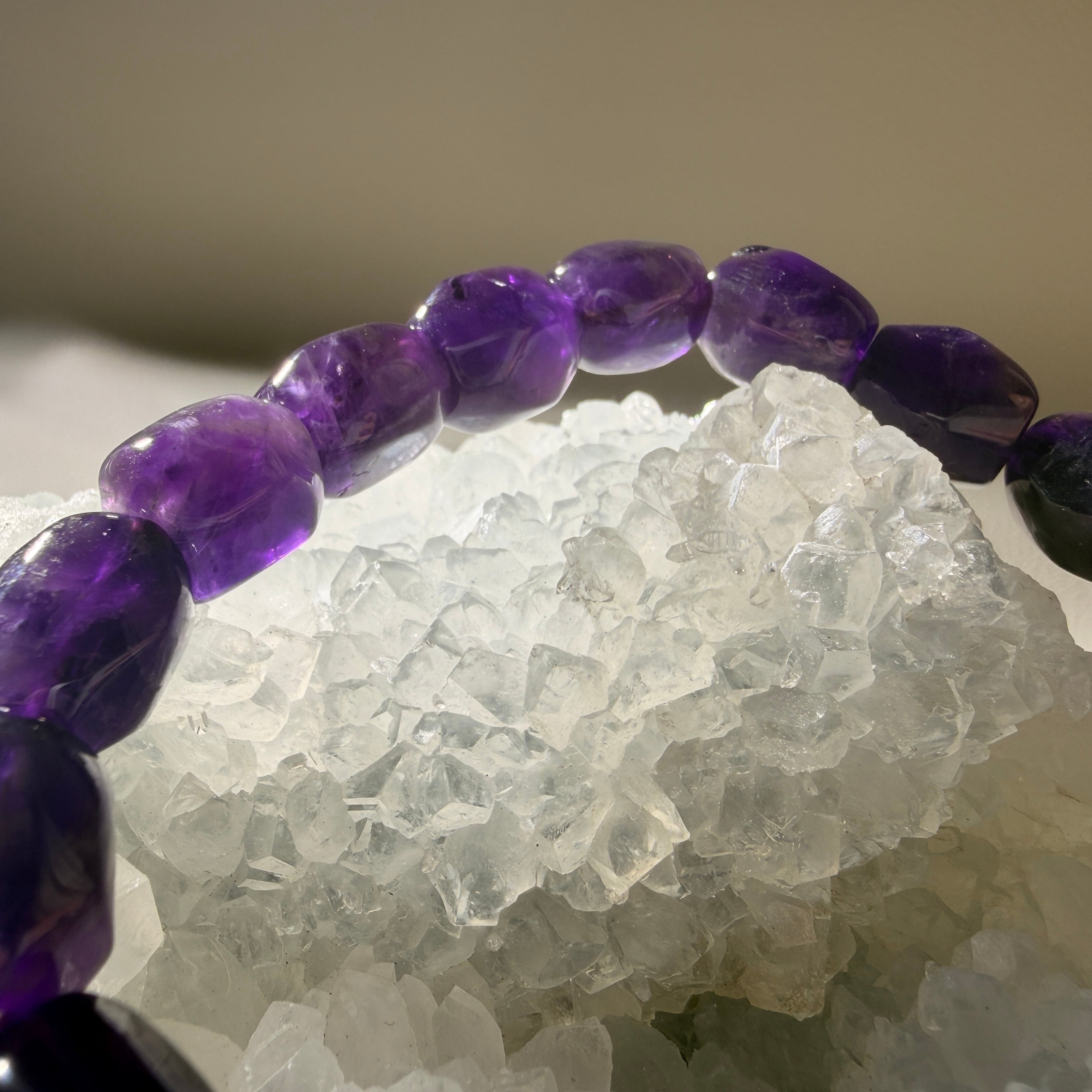 深みのある紫色が印象的なアメジストを、やわらかなタンブル形状でつないだブレスレットです。