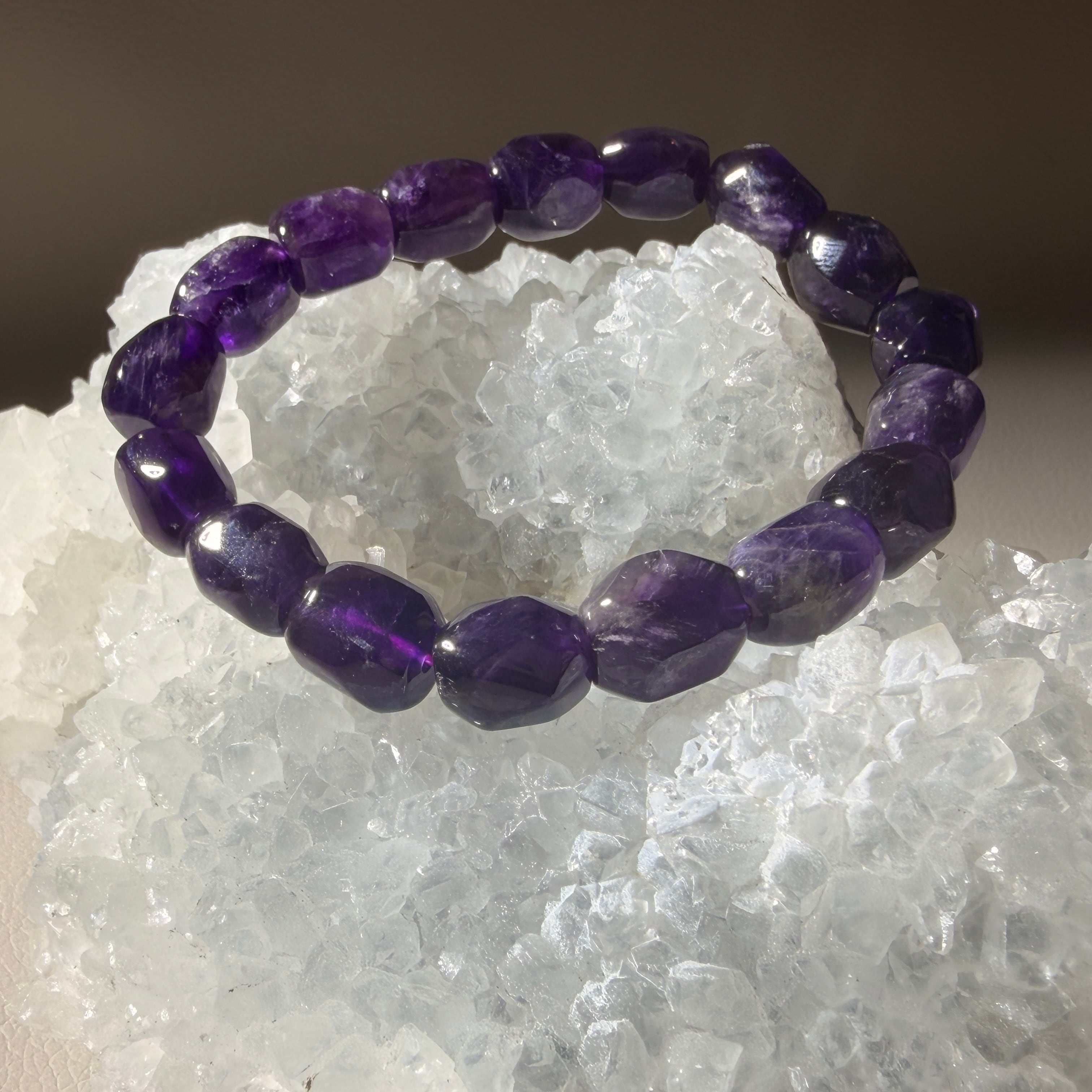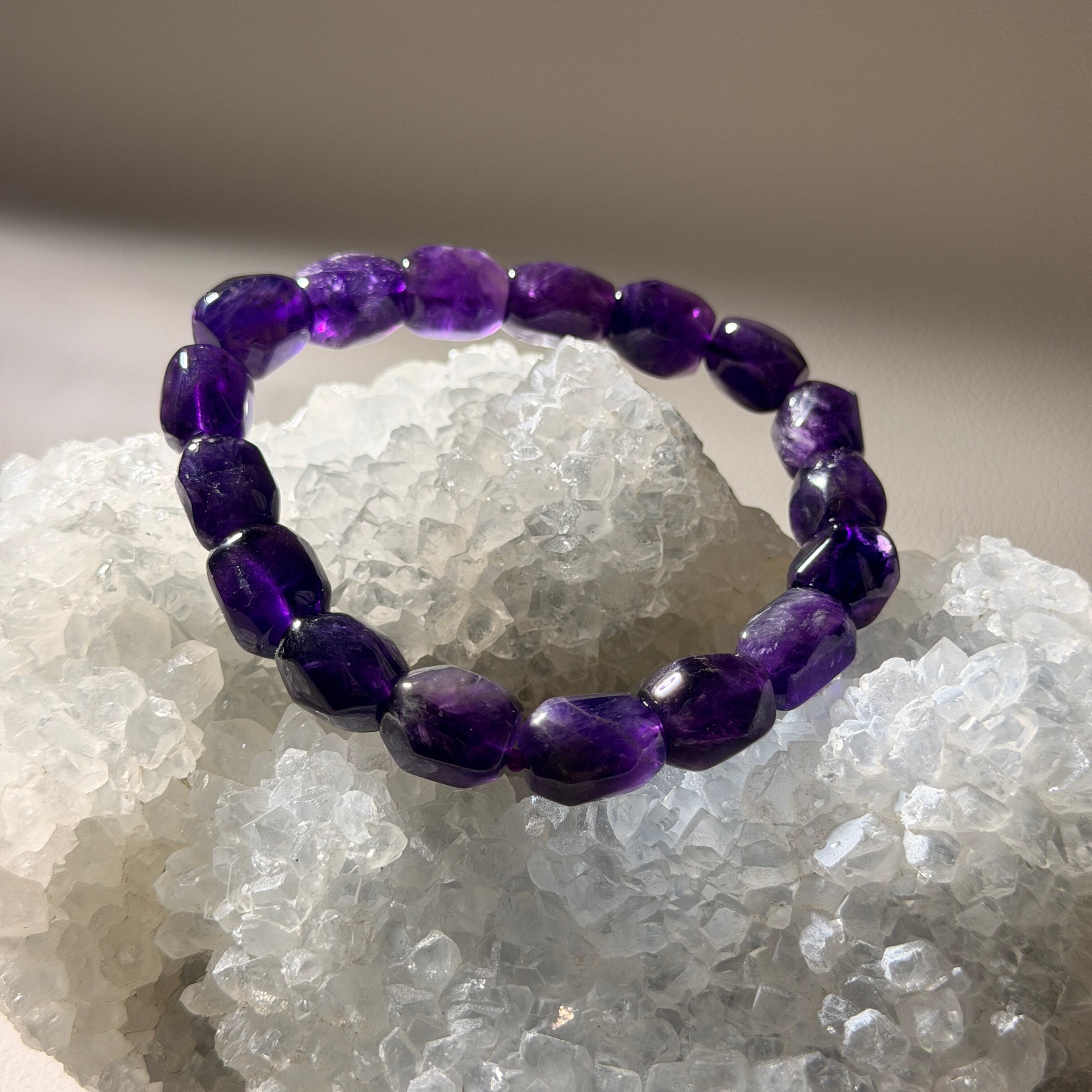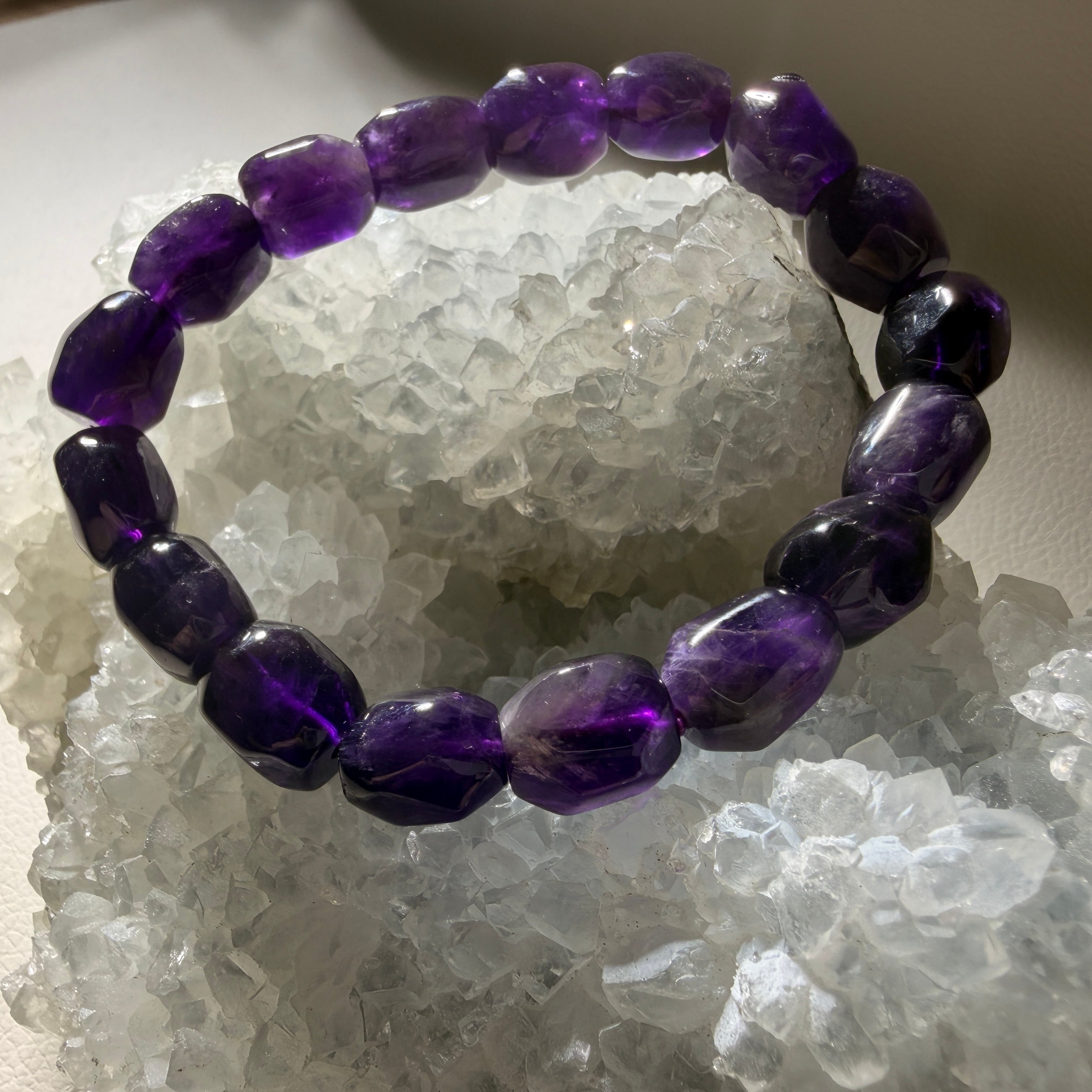 深みのある紫色が印象的なアメジストを、やわらかなタンブル形状でつないだブレスレットです。