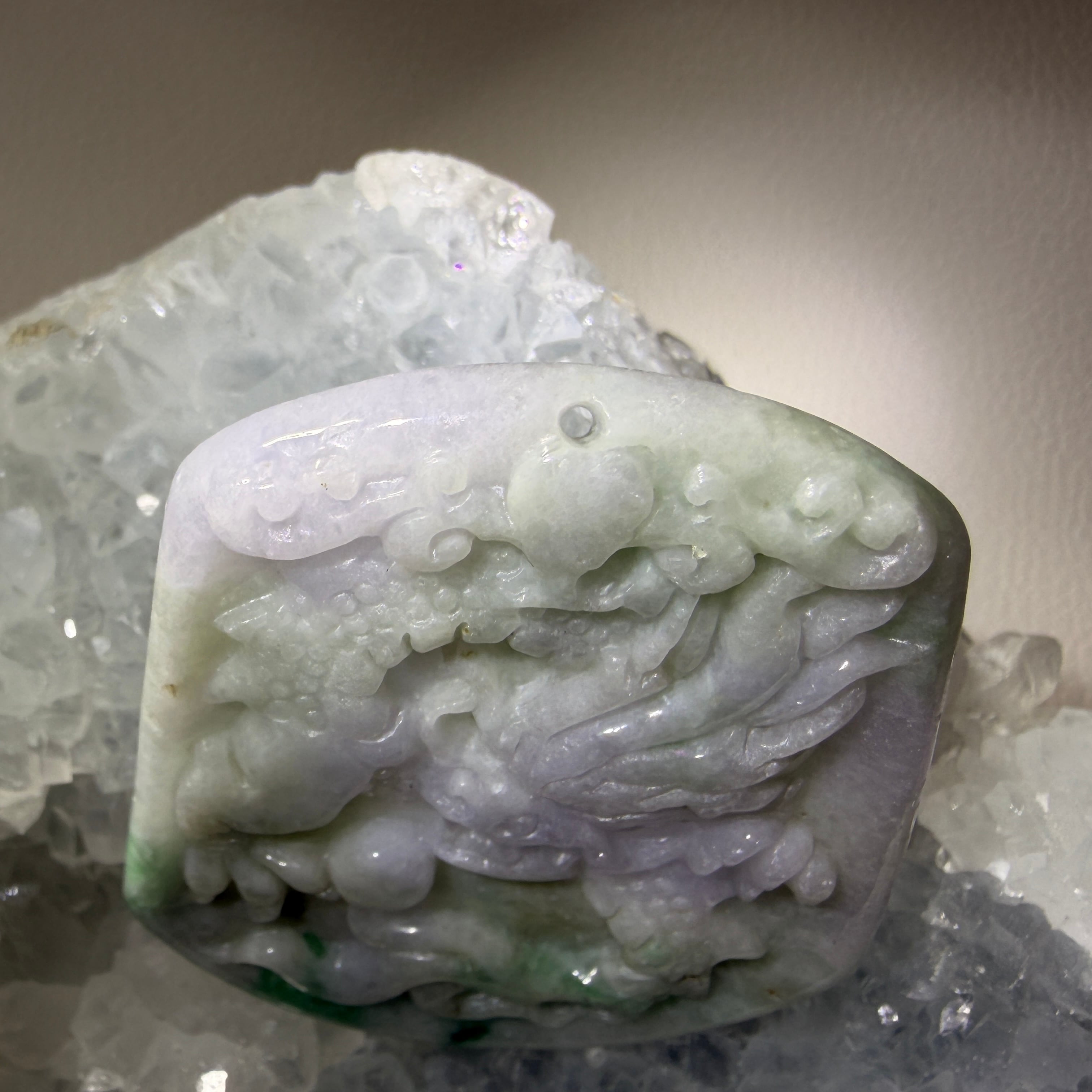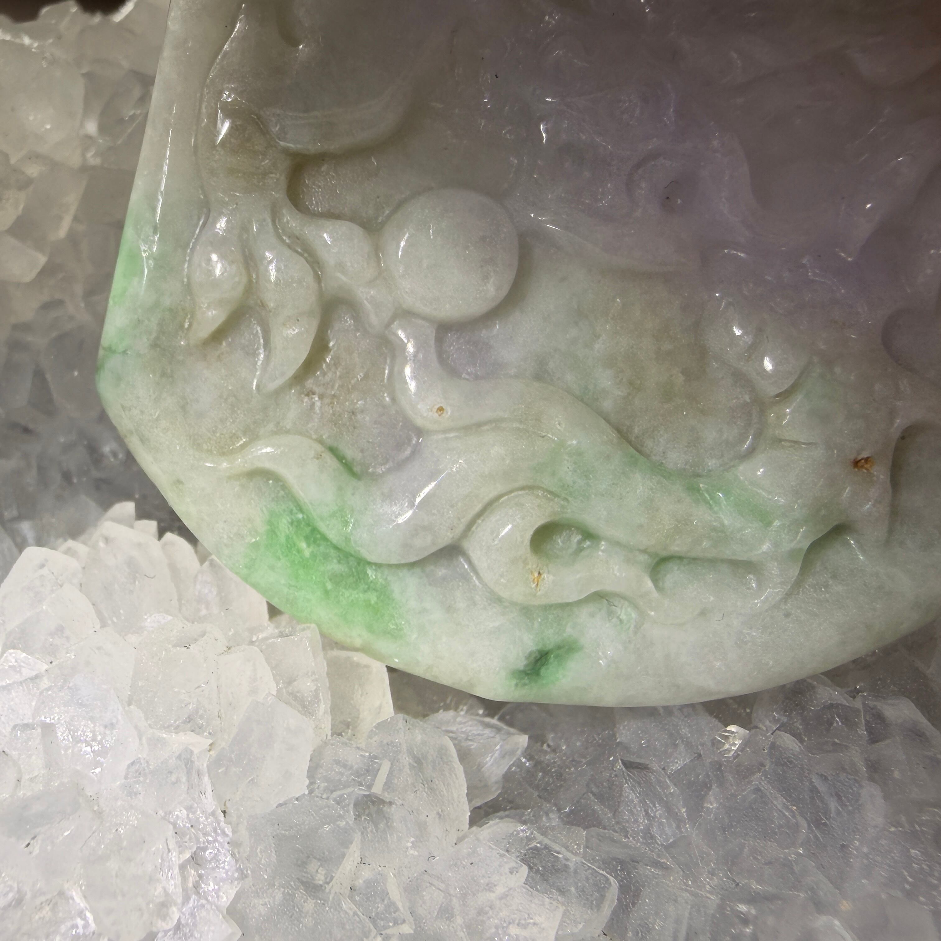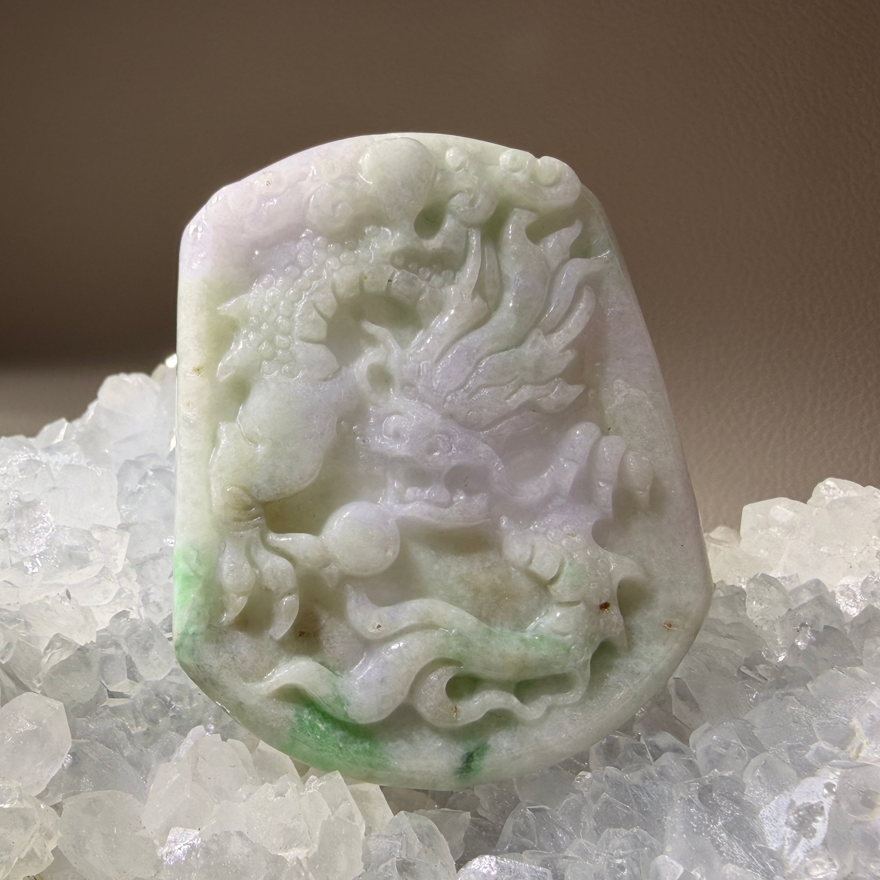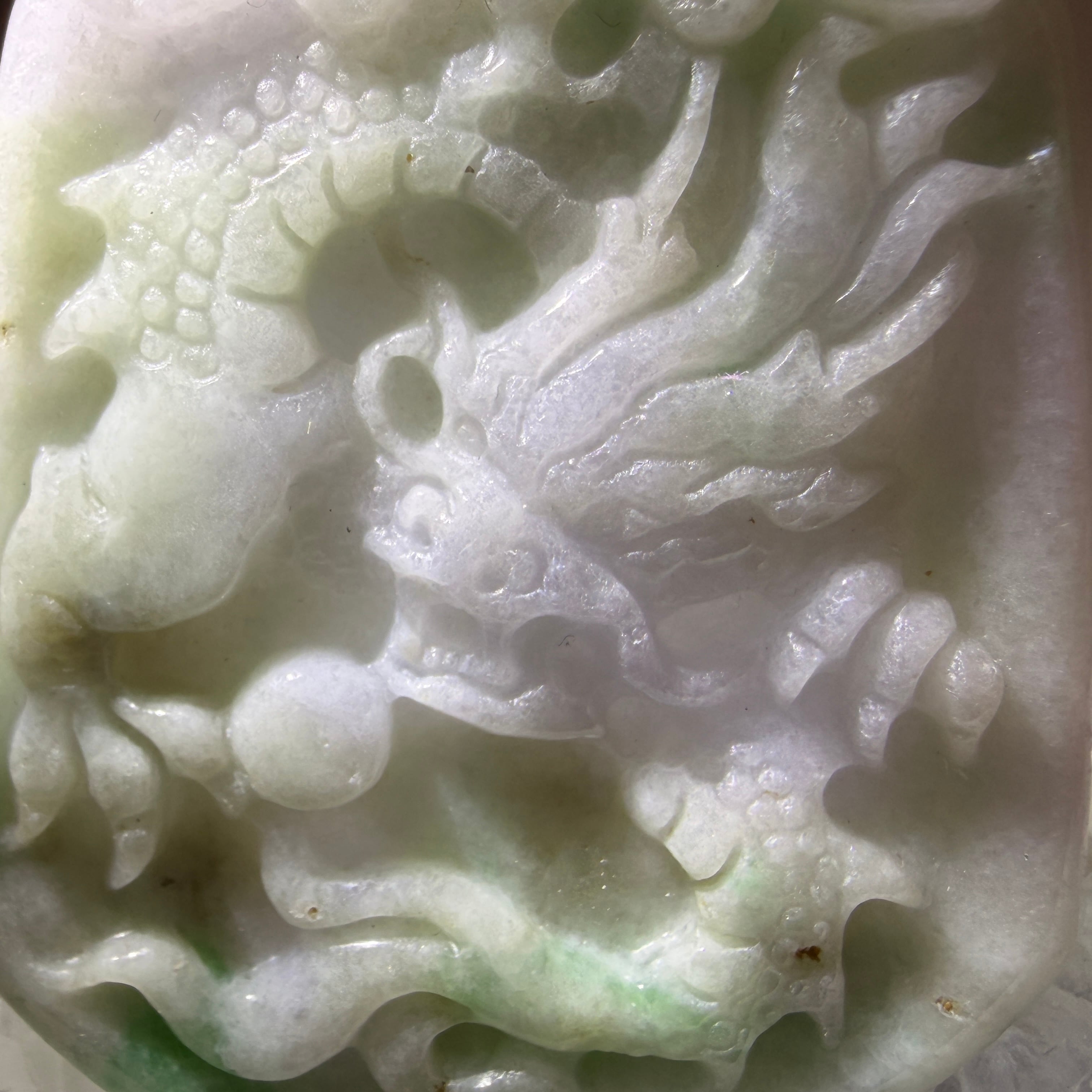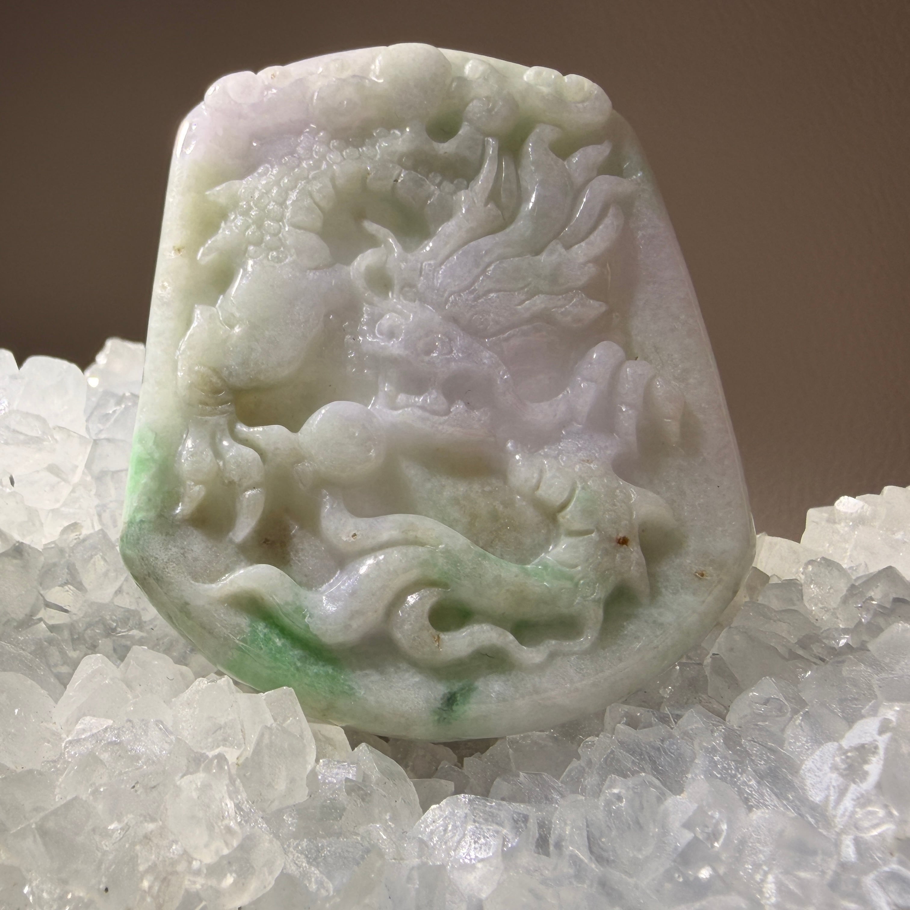 やわらかな白緑の色合いの中に、龍の姿が立体的に表現された翡翠のペンダントトップです。