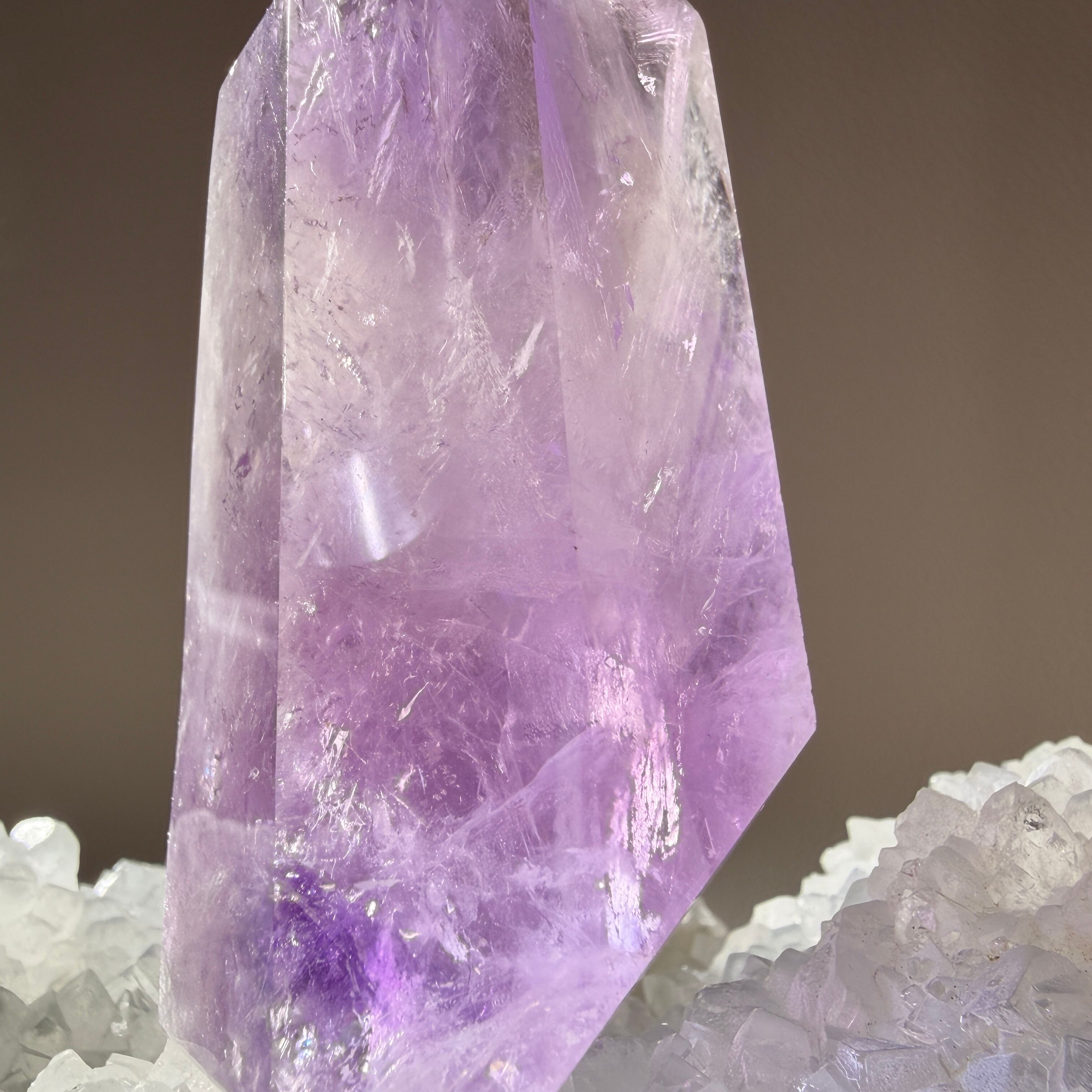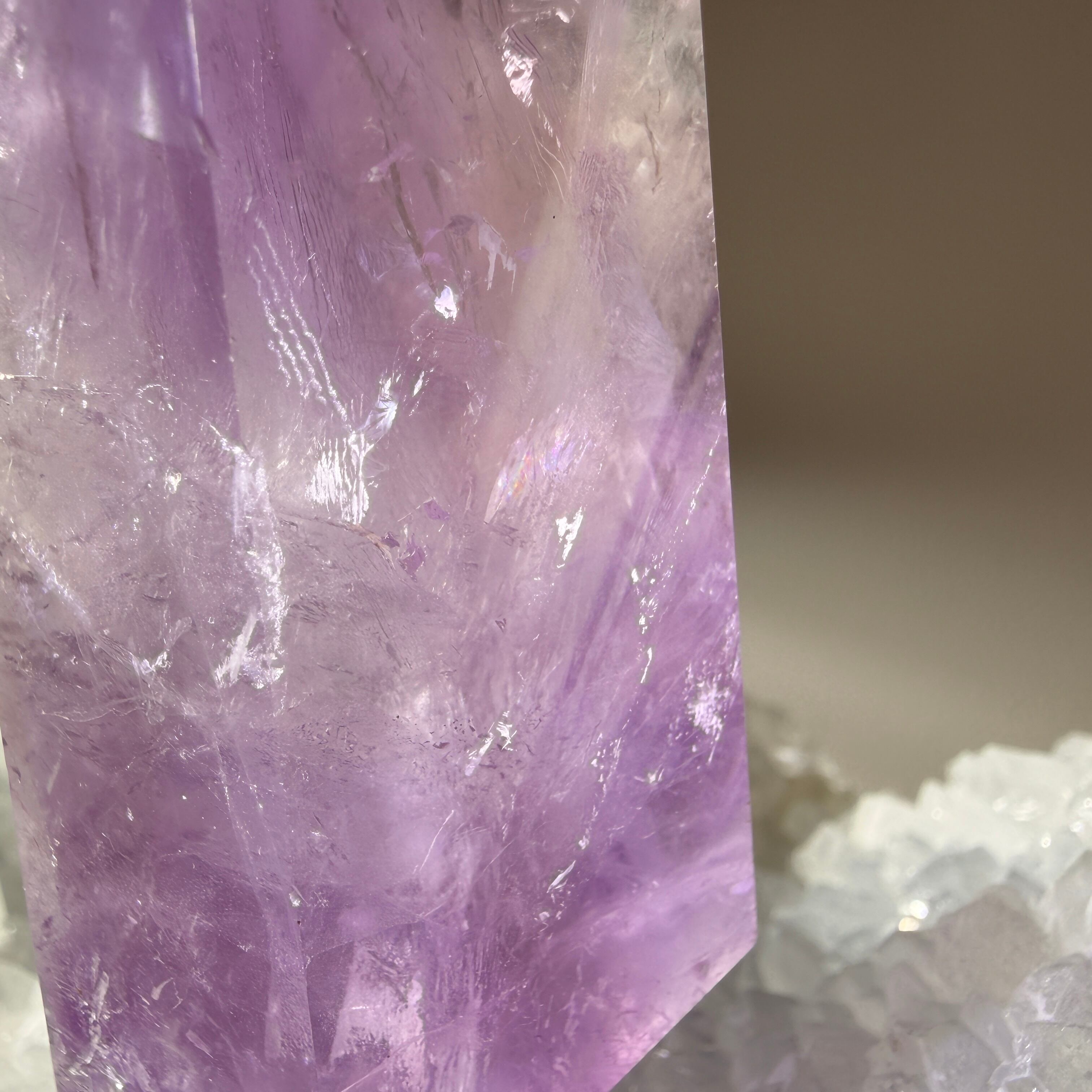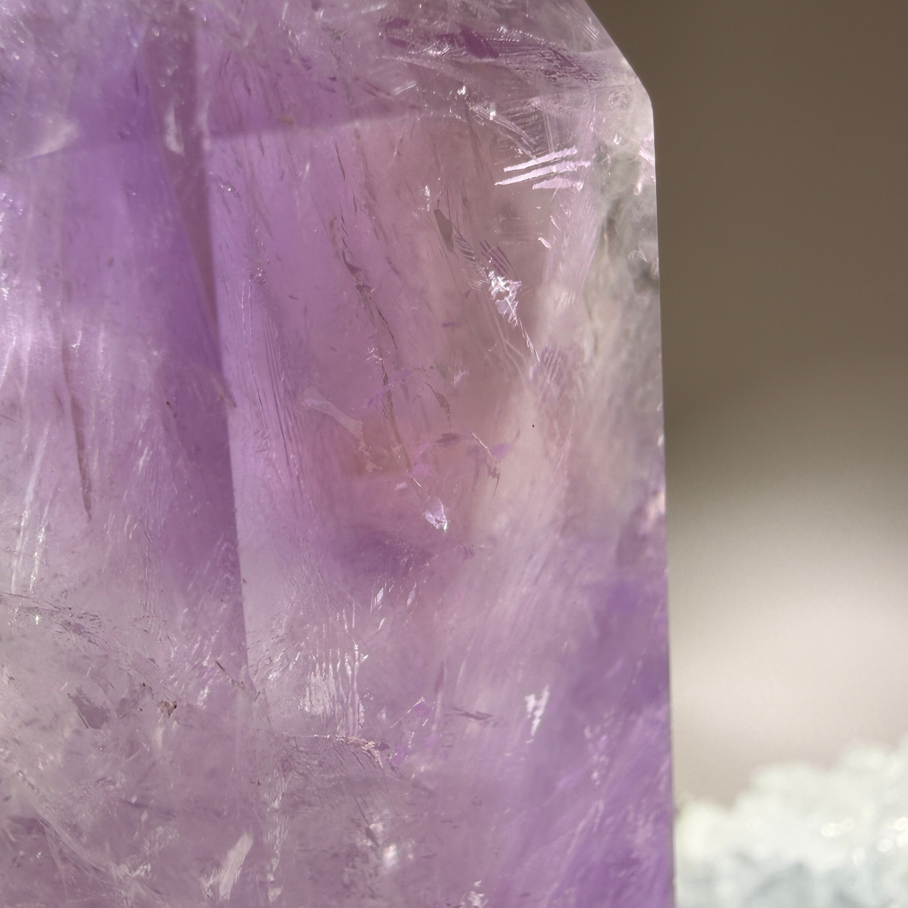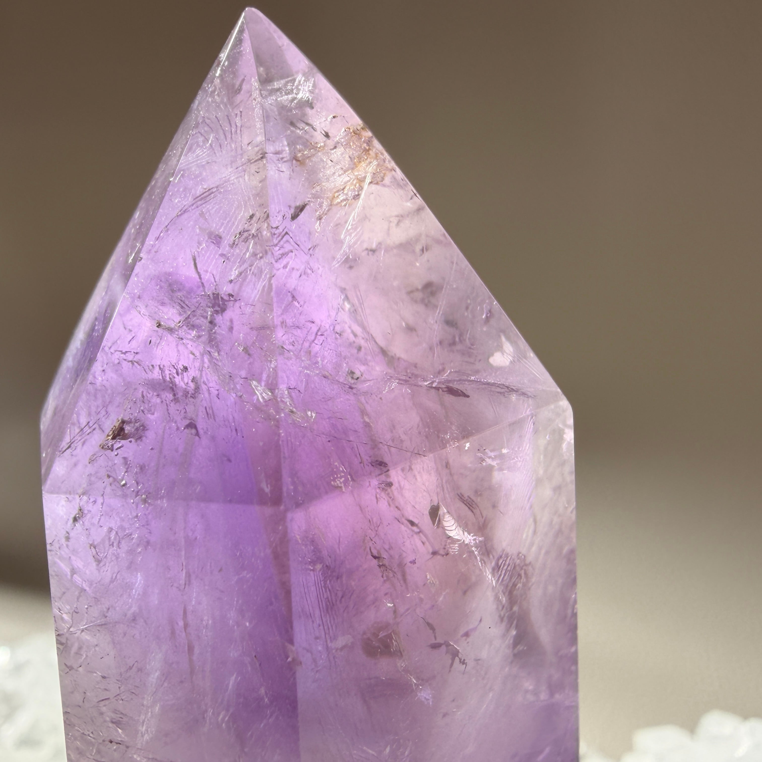 やわらかな紫の濃淡の中に、光を受けて虹のような表情が感じられるアメジストポイントです。