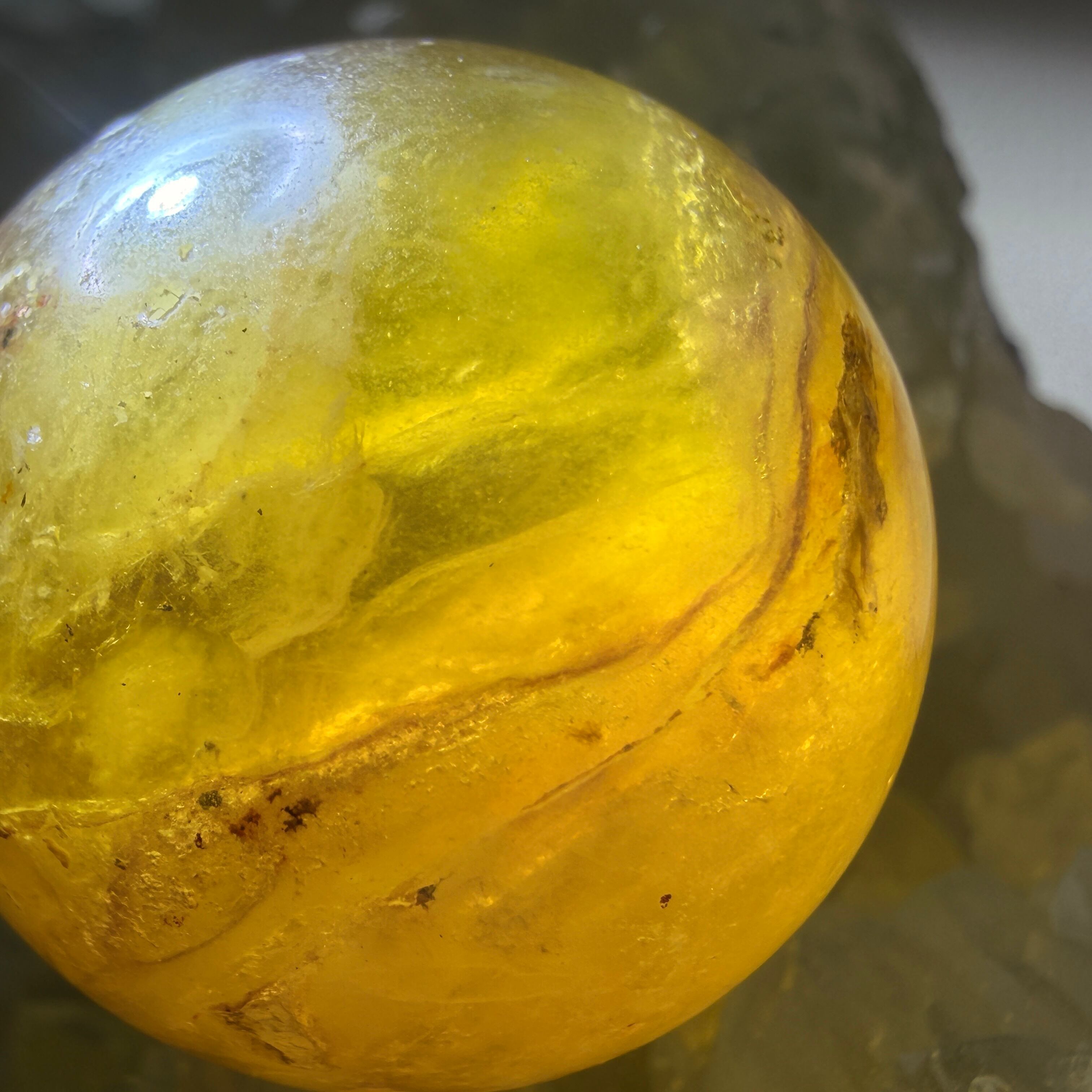 やわらかな色の重なりや、自然にあらわれた模様が印象的なフローライトのミニスフィアです。