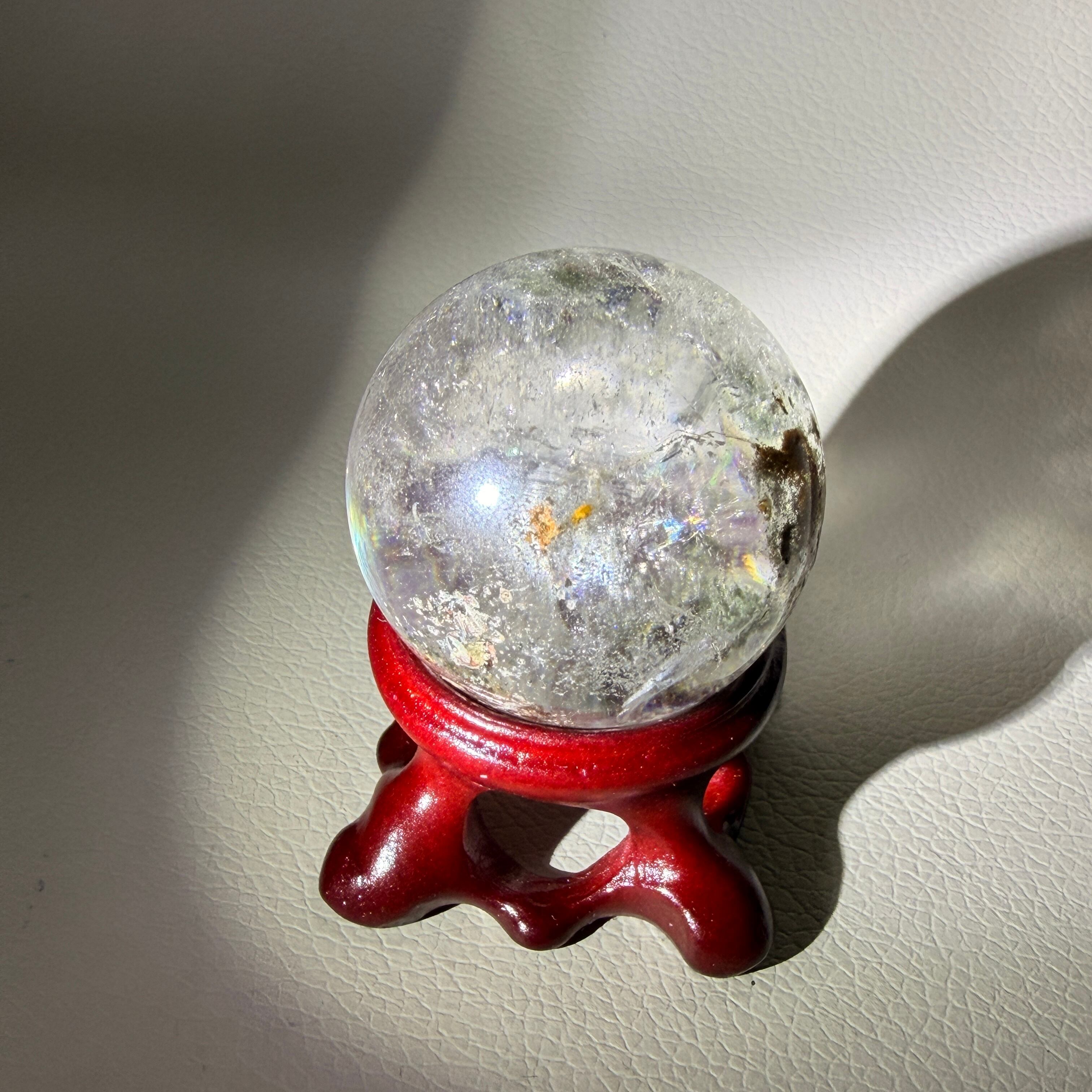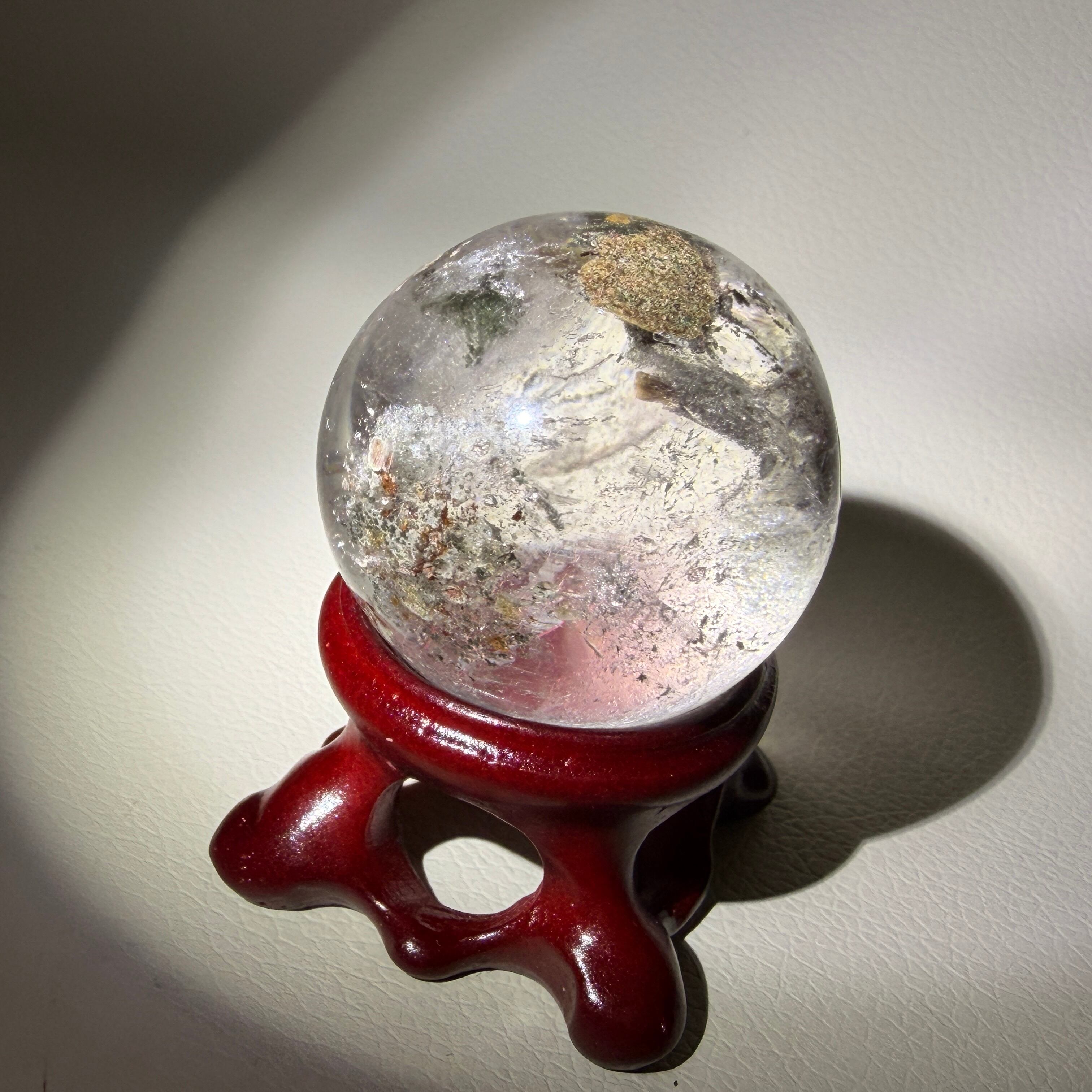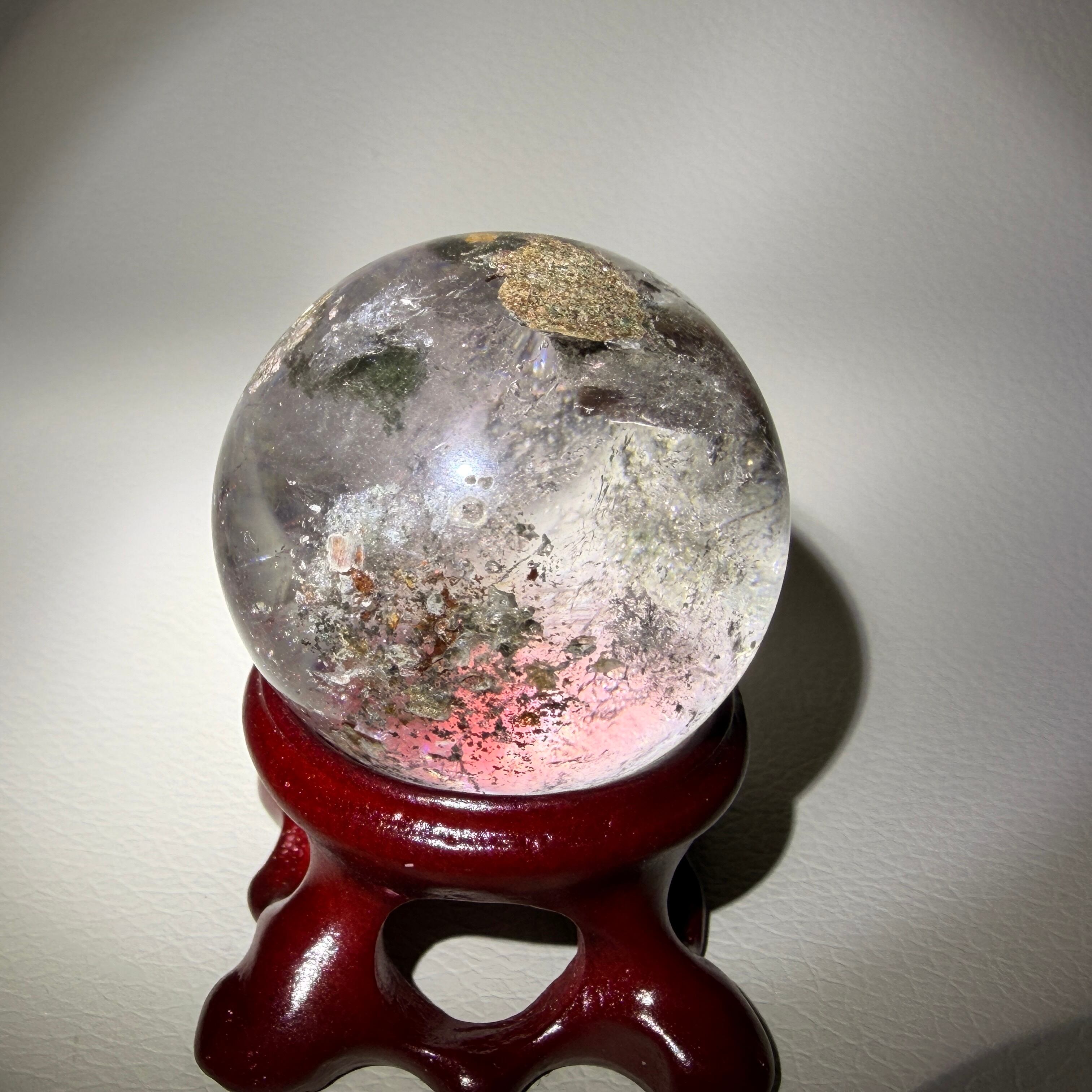 内側に景色を閉じ込めたような表情が広がる、ガーデンクオーツのスフィアです。