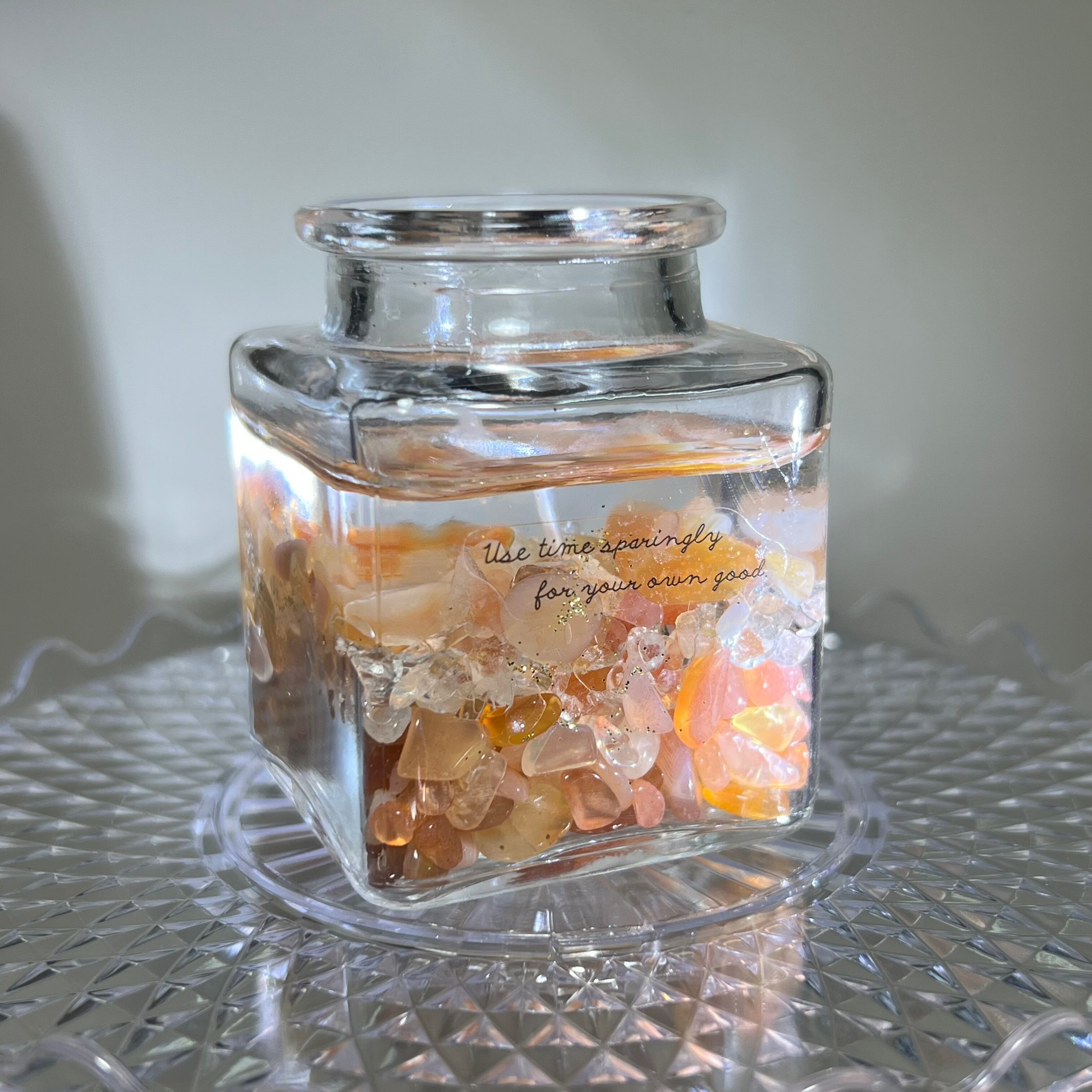 カーネリアンはカルセドニーの一種で、温かな赤橙色が印象的な石です。古くから印章や装飾に用いられ、意志と活力を象徴すると伝えられてきました。さざれ石ならではの不揃いな面が光を多方向に返し、ガラス越しにやわらかな輝きを見せます。